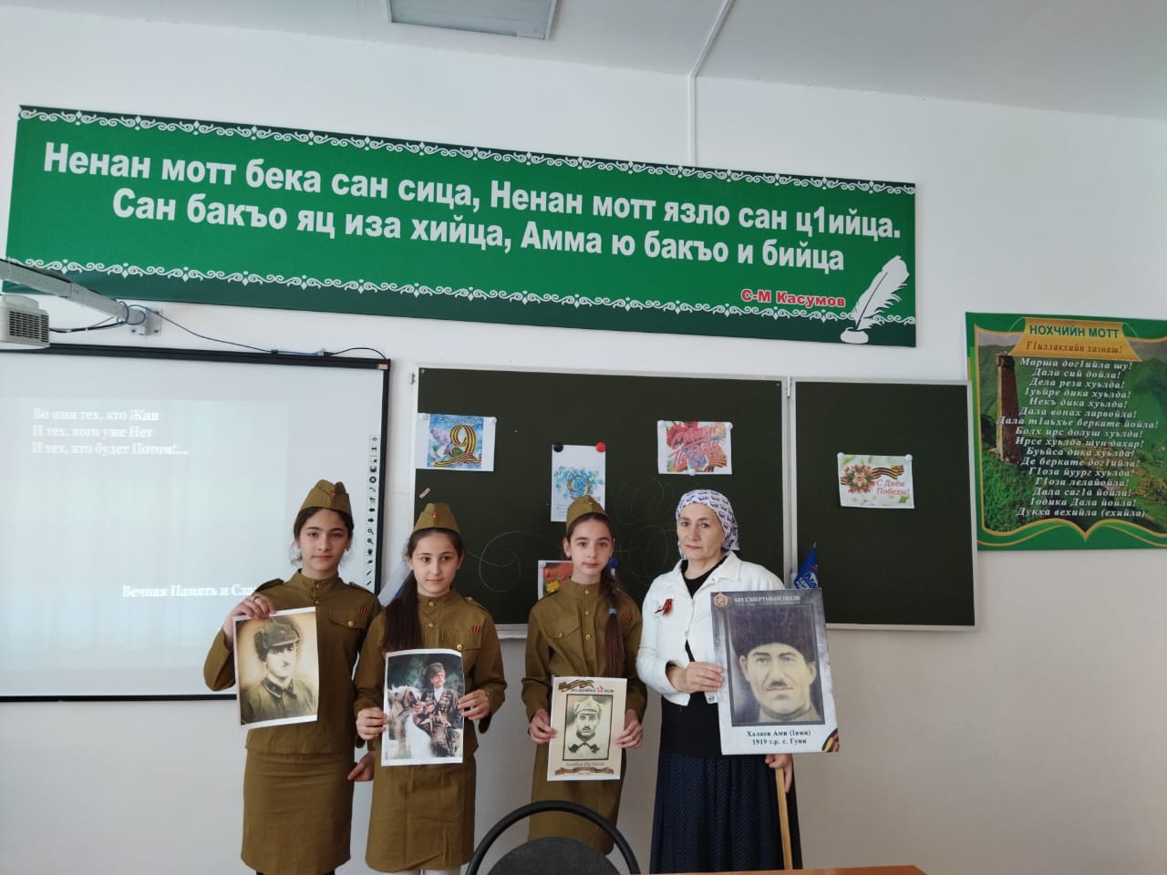 В соответствии с планом мероприятий, посвященных празднованию Дня Победы в Великой Отечественной войне, учитель истории и обществознания Зелимханов Сацита Турпалаевна провела Урок Мужества, посвященный героям и участникам ВОВ. Она рассказала ребятам о трудном военном времени, о подвигах наших солдат, о тружениках тыла, о детях-героях, принимавших участие в боевых действиях. Дети читали проникновенные стихи, пели военные песни.