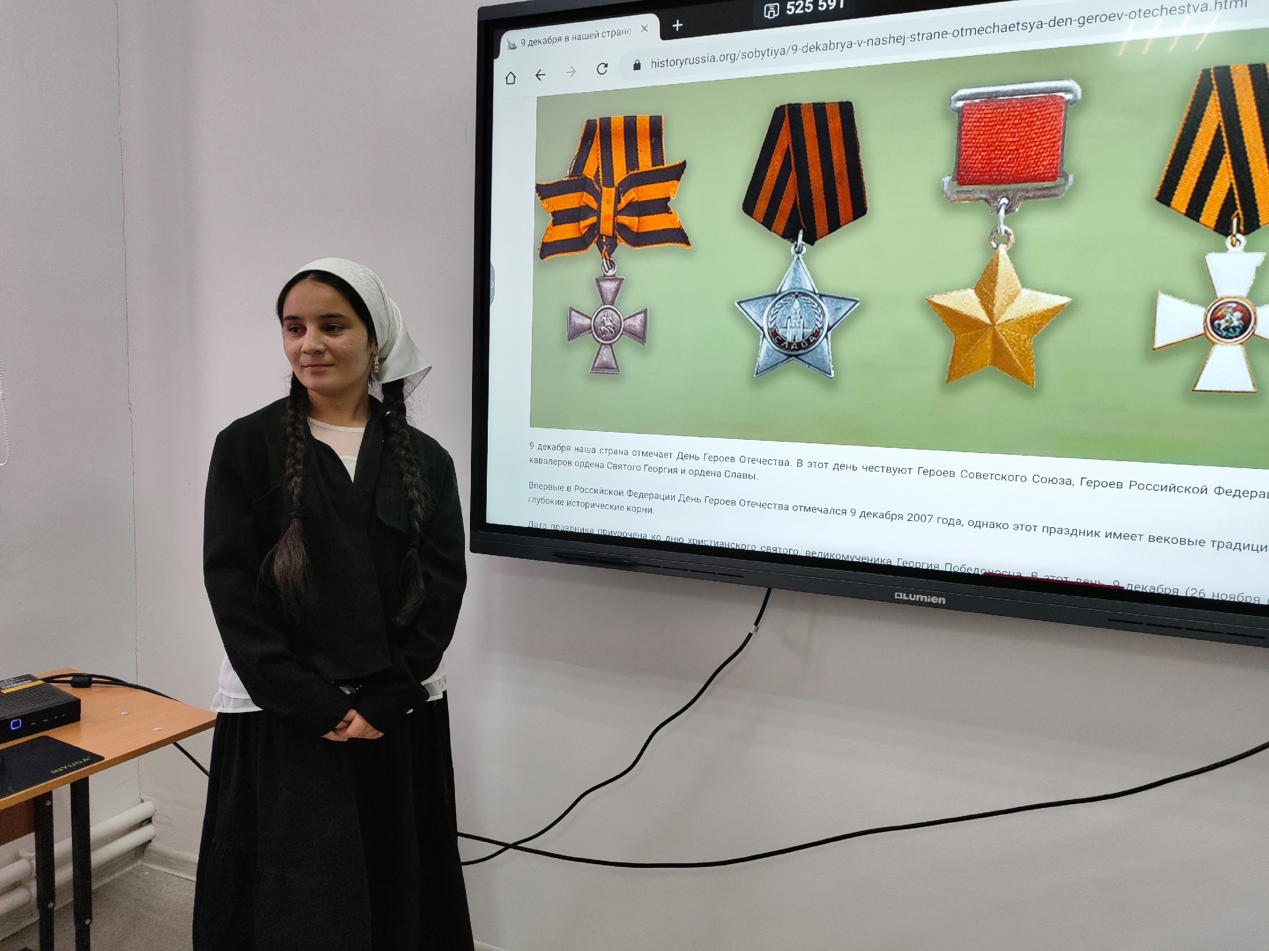 11.12.2023МБОУ «Гунинская СОШ» провели мероприятия, посвященные Дню героев Отечества9 декабря в школе прошли мероприятия, посвященные Дню героев Отечества. На уроках мужества сегодня вспоминали героев земли Российской: А. Невского, Д. Донского, К. Минина и Д. Пожарского, А. В. Суворова, М. И. Кутузова, Г. К. Жукова и других славных сынов Отечества. Для 5-7 классов прошел единый классный час «Дни воинской славы России». А для учащихся 5 класса прошла квест- игра «Секрет героизма». Для учащихся начальной школы музейный час «Их имена носят улицы города».«Хочется отметить, что мужество, стойкость, героизм – это то, что позволяет сохранить независимость и покой нашей Родины. Если все будут равняться на таких Героев – спасителей Отечества, наша страна будет в безопасности. И очень хочется надеяться, что такие героико-патриотические мероприятия помогут воспитанию у подрастающего поколения гражданского долга, воли к победе, отваги и мужества», - сказала директор школы Усумова Палина Мусаевна.