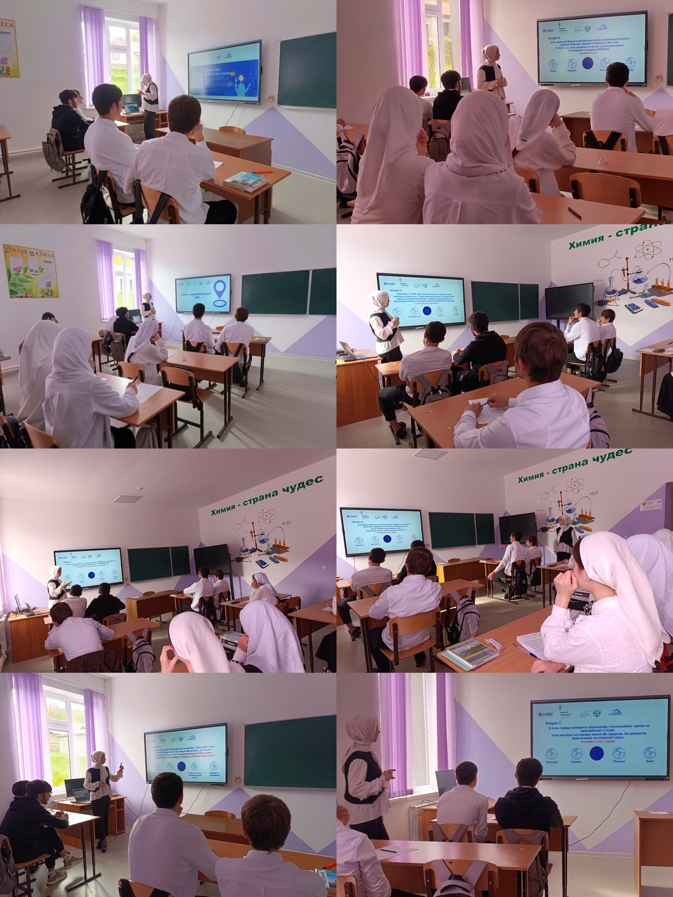 Во время урока:Продемонстрировали фильм о развитии науки на Северном Кавказе. Ученики узнали о работе крупнейшего астрономического центра, потенциале курортов, археологических раскопках и многом другом.Провели живое обсуждение с учащимися о перспективах научных исследований. Это обсуждение вызвало интерес и воодушевило детей.А теперь самое интересное! Состоялся захватывающий Урок-квиз.